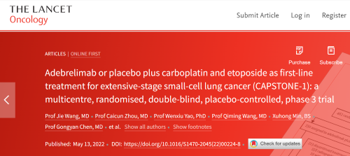 北京时间2022年5月14日,PG医药自主研发的PD-L1抑制剂阿得贝利单抗治疗广泛期小细胞肺癌的III期临床研究(CAPSTONE-1研究)成果正式全文在线发表于国际权威学术期刊《柳叶刀·肿瘤学》(《THE LANCET Oncology》,影响因子41.316)。CAPSTONE-1研究结果显示,阿得贝利单抗联合化疗一线治疗广泛期小细胞肺癌相较于安慰剂联合化疗可以显著延长患者总生存期至15.3个月[1],刷新现有免疫药物一线治疗广泛期小细胞肺癌的总生存纪录[2]。