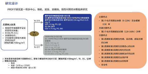PROFIT研究是首个在接受HEC患者中对比标准三联方案(福沙匹坦+帕洛诺司琼+地塞米松,FAPR+PALO+DEX)的多中心、随机、双盲、双模拟、阳性对照的III期注册临床研究[1]。该研究覆盖全国67家研究中心,共入组了754例未经化疗的中国恶性实体瘤患者,更具中国临床参考价值。患者随机分为两组,在每周期给予顺铂为基础的HEC前,分别接受磷罗拉匹坦帕洛诺司琼或FAPR+PALO治疗,同时口服地塞米松,连续观察两个化疗周期。主要终点是第1个化疗周期总体期CR率,关键次要终点为第1个化疗周期超延迟期CR率。此外,研究以对日常生活无影响(NIDL)的患者比例作为依据评估患者的生活质量(NIDL定义为总体呕吐生活功能量表(FLIE)评分>108或恶心/呕吐评分>54)(图1)[1,7]。