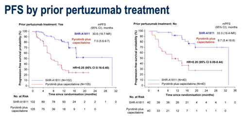 研究达到了主要终点。BICR评估的中位PFS方面,瑞康曲妥珠单抗组达到30.6个月(95%CI:16.8-NR),吡咯替尼联合卡培他滨组为8.3个月(95%CI:6.9-11.0)。HR=0.22(95%CI:0.15-0.34,P<0.0001)。